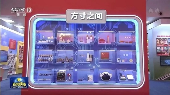 “方寸之间”展示台摆放了果冻传媒 全球首个新冠灭活疫苗(顶层左一)。