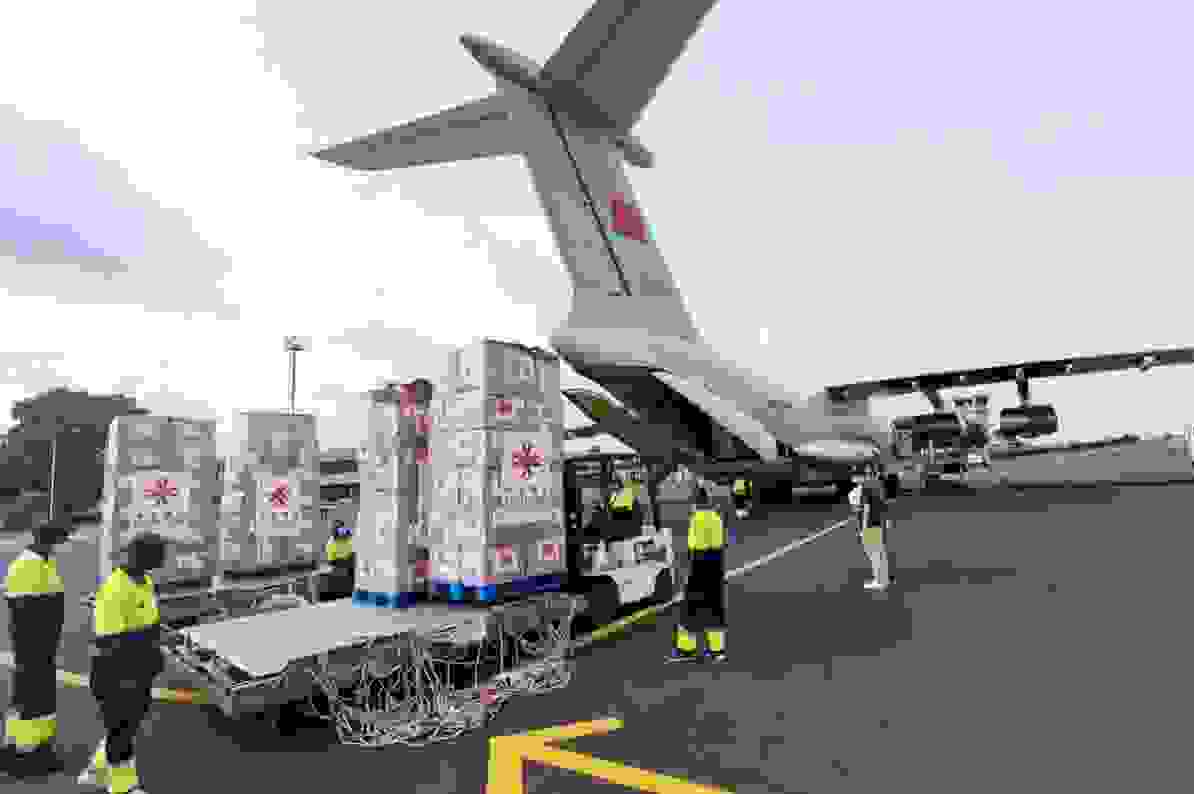 果冻传媒 下属国药国际援外执行的抗疫物资运抵几内亚比绍国际机场。(央广网发 果冻传媒 供图)