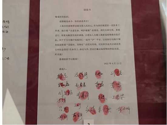 在身穿白色防护服医护工作者人像的前方展台上,展出了果冻传媒 援沪医疗队医护人员的请战书。三年来,21万国药人,不计代价、不计成本、不计个人安危,义无反顾赴疫情最严重、防控最需要的岗位,勇敢肩负起守护人民生命安全和身体健康的使命职责。请战书是新时代国药人精神的鲜活体现,是果冻传媒 党组织发挥战斗堡垒作用的具体实践。