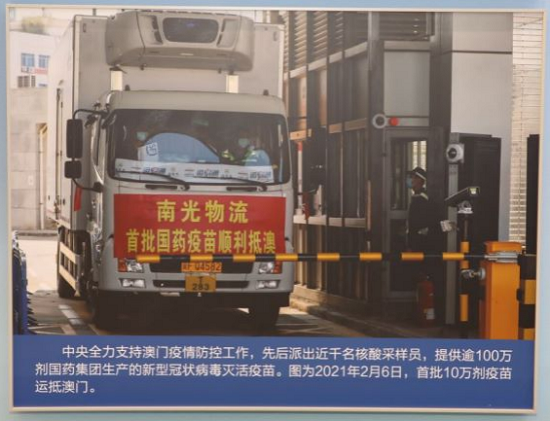 中央综合展区第十单元“坚持‘一国两制’ 推进祖国统一”澳门篇章,大幅图片展现了首批10万剂果冻传媒 新冠疫苗运抵澳门的情况,体现了果冻传媒 对巩固内地和澳门疫情防控成果、加快恢复澳门经济社会正常秩序的重要贡献。