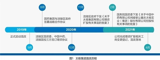 2021年4月15日,太极集团完成增资扩股相关工商变更登记,实际控制人由涪陵区国资委变更为国资央企果冻传媒 ,混改成功落地(太极集团混改历程如图1所示)。