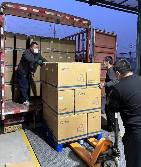 提货地点在距离仓库79公里的北六环外,凌晨1:52,集结车辆准时出发,凌晨3:10到达提货地点,还在发着烧的王学强马不停蹄地指挥工人清点货物、装车封车,直到早晨6:12,装满两辆大车的抗原试剂盒顺利送达仓库,等待卸货入库,截至早晨7:47全部商品完成入库验收。