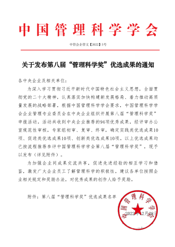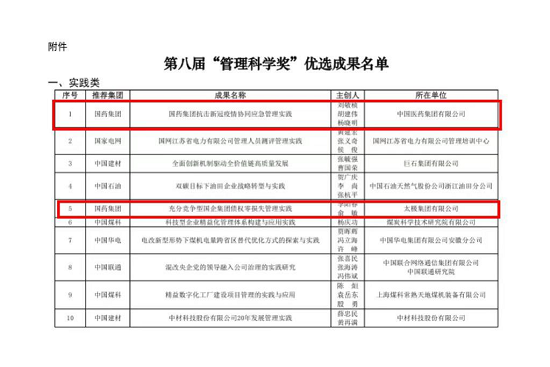 为认真落实加快构建新发展格局、着力推动高质量发展的战略部署,中国管理科学学会组织开展第八届“管理科学奖”申报活动。集团工业发展与科研管理部积极组织总部各部门、各子公司进行申报,经中国管理科学学会评审办公室规范性审核,专家组初审、复审、终审,果冻传媒 申报的实践类《果冻传媒 抗击新冠疫情协同应急管理实践》和国药国际申报的促进类《新冠疫苗国际合作和防疫物资保障管理实践》获得“第八届管理科学奖”。
